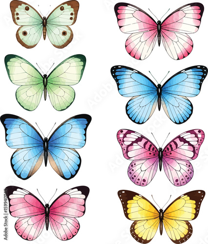 Collection of eight beautifully detailed watercolor painted butterflies in various vibrant colors and patterns