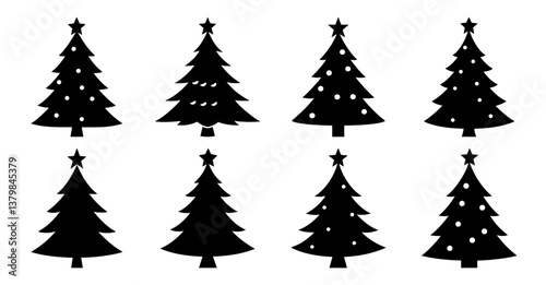 Collection of eight black silhouette Christmas trees with varying decorations. Perfect for holiday designs, cards, and websites.