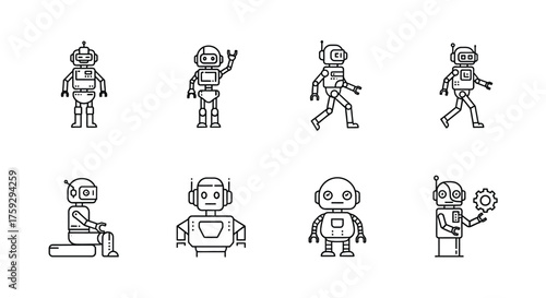 Collection of eight hand-drawn robot characters in various poses and styles perfect for design projects. vector