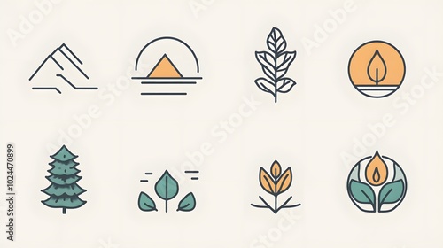 Collection of Eight Minimalist Line Art Icons Depicting Nature