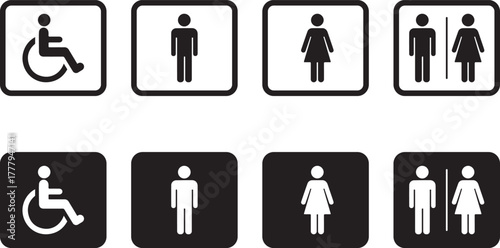 Collection of eight square icons representing restroom facilities including accessible wheelchair symbols and gendered male and female figures in white and black variations