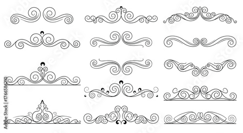 Collection of elegant black and white vintage decorative flourishes and borders for design.