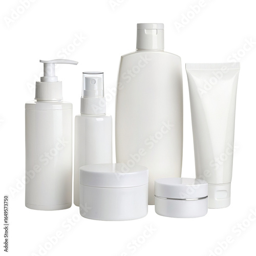 Collection of empty white cosmetic containers for skincare and beauty product packaging display
