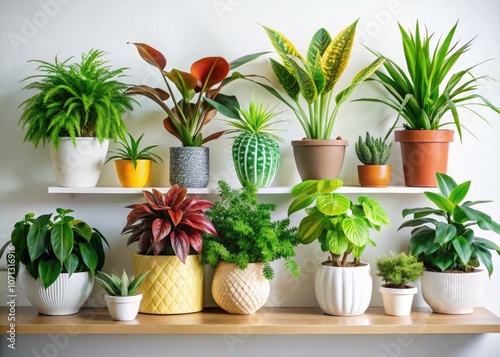 Collection of Exotic Houseplants in Ceramic Pots on White Shelf - Home Garden Decor, Indoor Plants, Greenery, Minimalist Style, Houseplant Care, Transparent Background