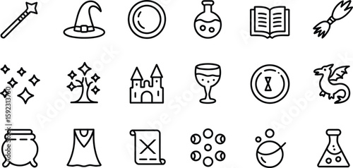 Collection of fantasy magic icons in a simple line drawing silhouette style