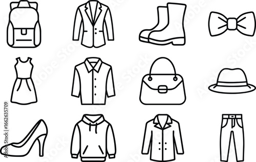 Collection of Fashion and Clothing Line Icons Including Bags, Shoes, Dresses, Jackets, Skirts, Accessories, and Watches for Modern Style and Apparel Design