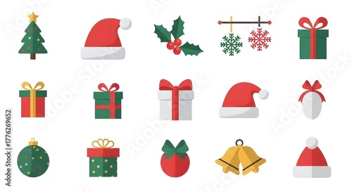 Collection of festive christmas icons including trees gifts santa hats and ornaments