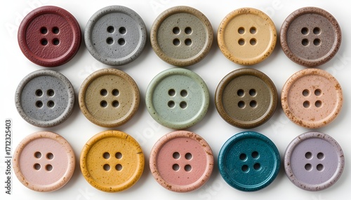 Collection of fifteen colorful ceramic buttons isolated on white background, arranged in a neat pattern