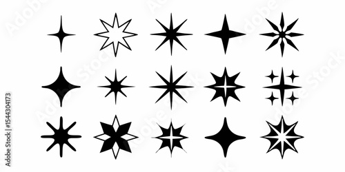 Collection of Fifteen Different Starburst Sparkle Shapes in Black and White for Graphic Design and Illustration Projects