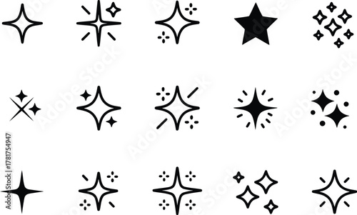 Collection of Fifteen Unique Black Sparkle Star Icons on White Background Illustration