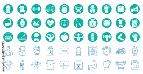 Collection of fitness and health vector icons featuring gym equipment, exercise, heart health, and wellness-related symbols in a modern flat and outline style for web and app design