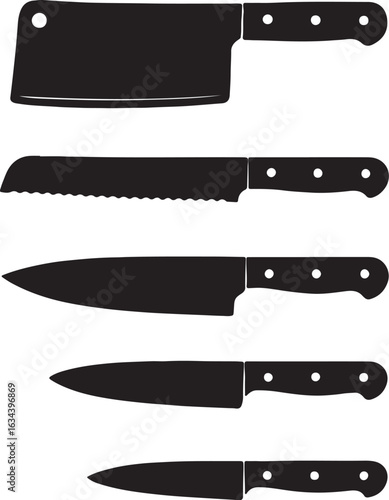 Collection of five black kitchen knives on a white background kitchen knife cleaver