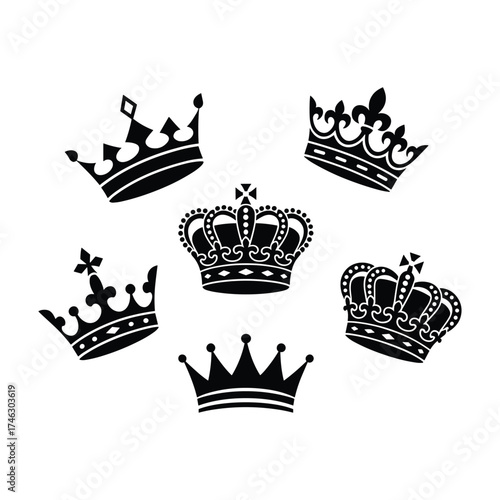 Collection of five black silhouette royal crowns with intricate details on a white background king queen