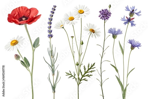 Collection of five delicate wildflowers including a red poppy lavender daisies and cornflowers on a white background
