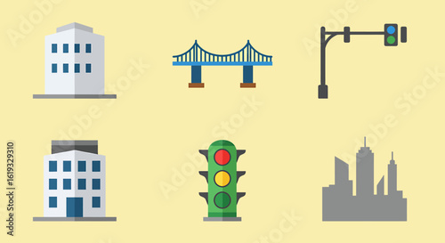 Collection of flat vector icons depicting city elements: buildings, a bridge, traffic lights, and a skyline silhouette on a beige background.