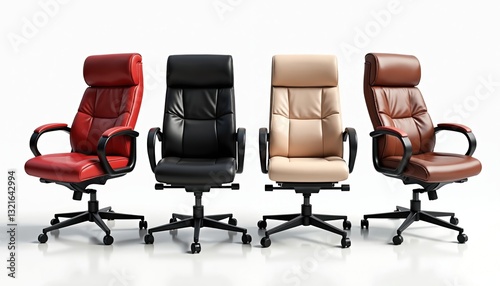 Collection of four leather office chairs on wheels. Red, black, beige, brown colors. Executive armchairs for boss, manager. Comfortable furniture object for interior design. Empty seats isolated on