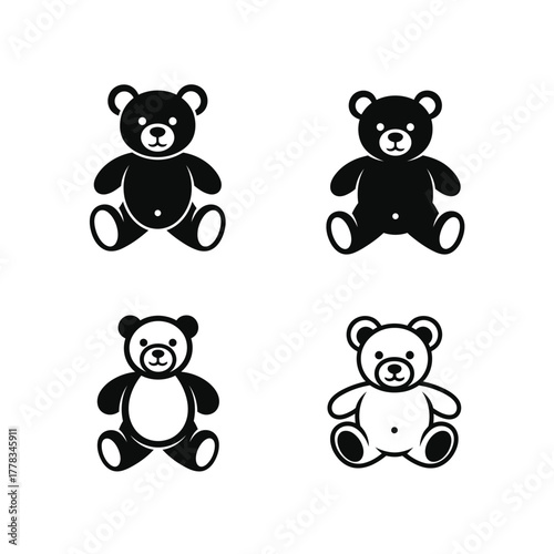 Collection of four simple, classic teddy bear icons in black and white for design and illustration purposes