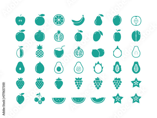 Collection of fresh healthy fruits icons in various shades of green and blue