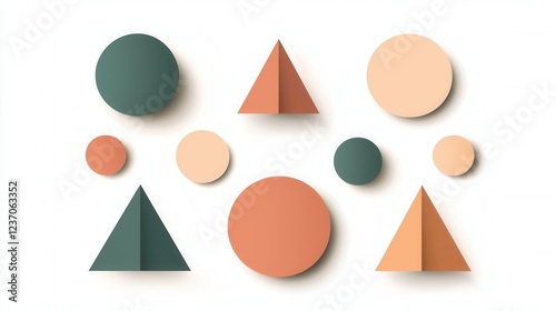 Collection of geometric shapes arranged in a circular pattern on a white background. there are nine shapes in total, each with a different color - green, orange, pink, and light brown.