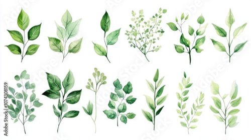 Collection of green leaves herbs and branches Floral design components Watercolor botanical clipart