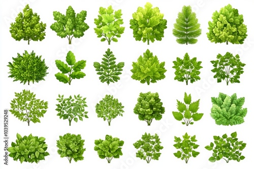Collection of green tree species in various shapes and sizes symbolizing botanical diversity nature conservation and plant identification for educational purposes