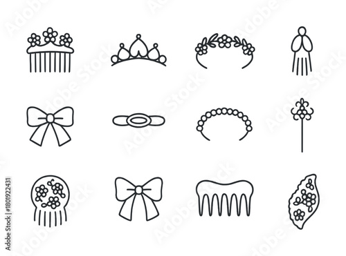 Collection of hair accessories: bows, combs, tiaras, and hairpins in minimalistic style