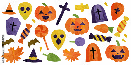 Collection of halloween elements including pumpkins ghosts bats candy crosses tombstones and witch hats