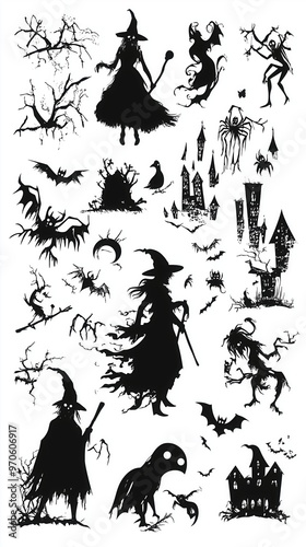 Collection of halloween silhouettes icon and character., witch, creepy and spooky elements for halloween decorations, silhouettes, sketch, icon, sticker. Hand drawn vector illustration