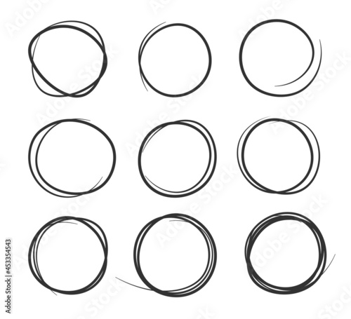 Collection of hand drawn black highlight circle. Highlighter marks, strokes. Design elements isolated on white background.