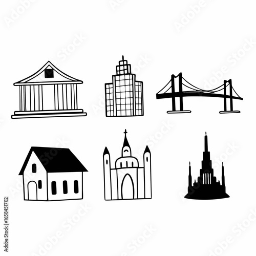 Collection of hand drawn buildings and landmarks for architecture and travel isolated on white background