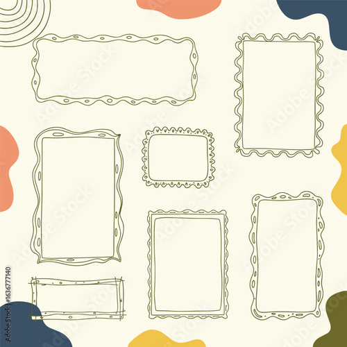 Collection of hand drawn decorative frames and borders with abstract shapes background