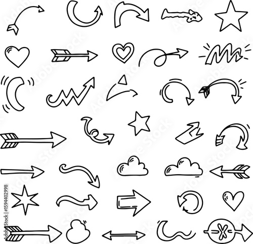Collection of hand drawn doodle arrows stars hearts and clouds silhouette
