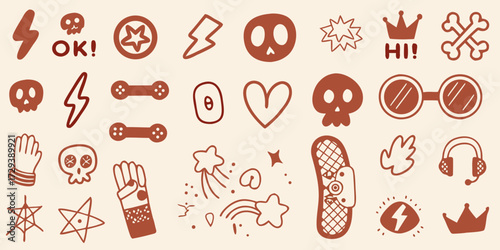 Collection of hand drawn doodle icons and symbols in brown on a cream background