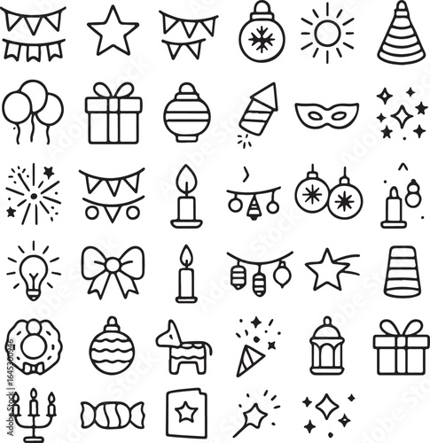 Collection of hand drawn festive celebration icons including balloons gifts fireworks masks candles and party hats for holidays and events