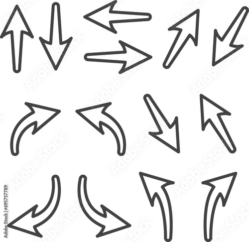 Collection of hand drawn lines arrows with triangle corner. Sketch elements, including arrow lines, directional arrows, and curling arrows. Vector illustration in EPS 10.
