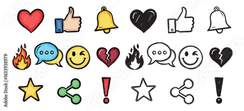 Collection of hand drawn social media icons featuring hearts likes bells chat bubbles flames stars shares and exclamation marks