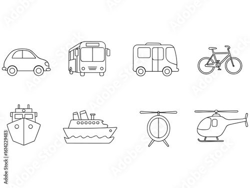 Collection of hand drawn transportation icons including cars boats and aircraft