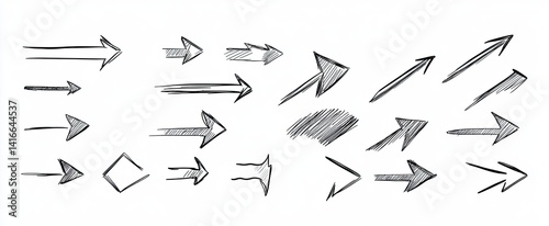 Collection of hand-drawn arrows in various styles and directions. Simple, sketched design elements