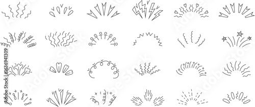 collection of hand-drawn continuous line icons illustrating bursts, explosions, confetti, and surprise rays. Each minimalistic design conveys dynamic motion and expressive energy through abstract shap