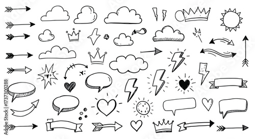 Collection of HandDrawn Doodle Elements Clouds Arrows Hearts and Stars.