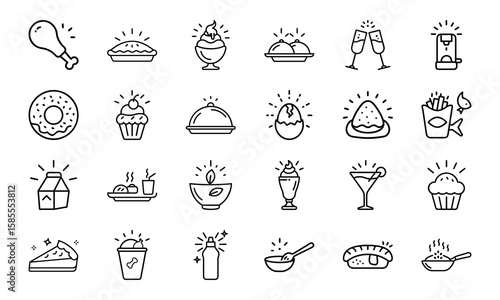 Collection of Hand-Drawn Food and Drink Line Icons with Light Effects Featuring Fast Food, Desserts, Beverages, and Hot Meals on White Background