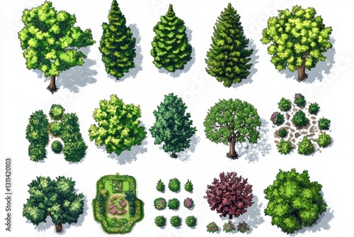 Collection of hand-drawn treetop views. Ideal for game design, landscaping, or architectural projects needing various tree types.