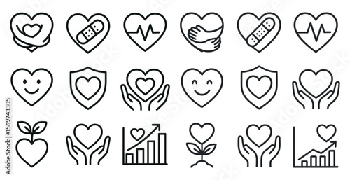 Collection of heart icons with one saying "love" and others saying "care" and "protection"