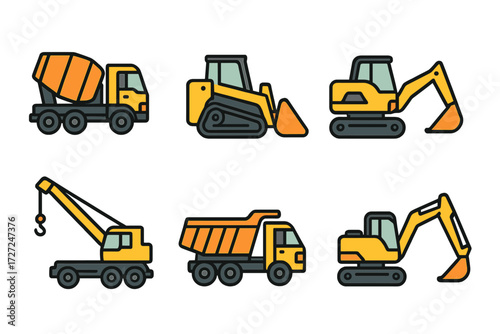 Collection of heavy construction vehicles and industrial equipment including cement mixer, loader, excavator, crane, and dump truck for building projects