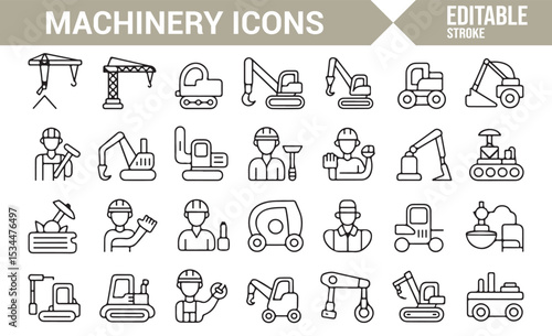 Collection of heavy equipment icons representing construction vehicles and workers for industry and engineering designs.
