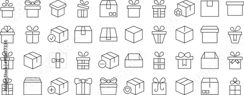 Collection of icons of boxes and giftboxes as holiday and delivery symbols for Advertisement. Suitable for books, stores, shops. Editable stroke in minimalistic outline style. Symbol for design