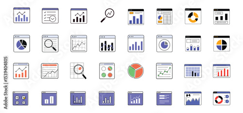 Collection of illustrated data analysis icons representing financial growth and business strategies for informative presentations