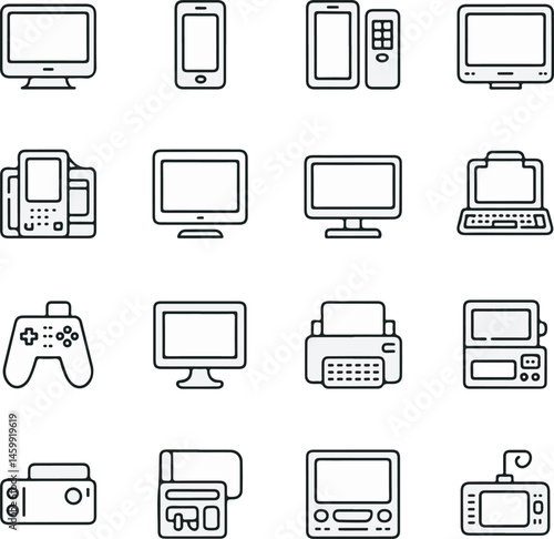 Collection of illustrated outline icon set featuring various electronic devices and gadgets