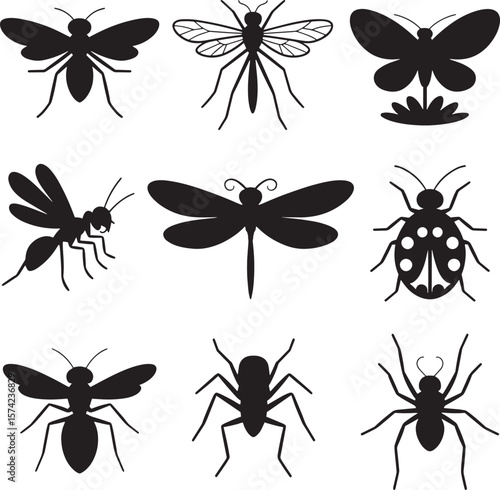 Collection of insect silhouettes including butterflies dragonflies ladybugs ants and spiders butterfly