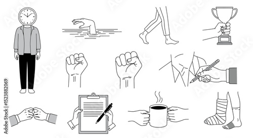 Collection of Line Art Illustrations Depicting Human Actions and Emotions